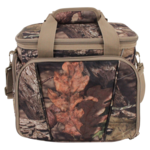 Liberty Camo Camping Cooler. Full count 600 denier, Insulated 12-can cooler w/room for ice. Front pocket unzips to reveal a pull-down tray for four drinks. Side zip and mesh pockets. Fabric wrapped handle. Detachable, adjustable strap. 12 x 11 x7: Mossy Oak Breakup Country. Imprint area: 4.5x7.5.